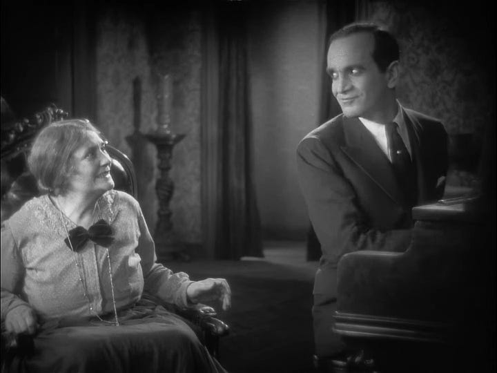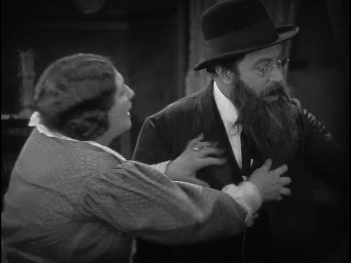 We, of course, are meant to side with the son and see the father as backwards and ultra-conservative. The film expects this of us. And then thinks it’s clever by turning the father character on his head. The father character is at first entirely disapproving of his son’s pursuit of ““jazz”” (double scare quotes there, I mean business). The mother is more favorable towards their son’s artistic pursuits, although clearly wants him to not abandon his Jewish roots. And so Jolson’s character packs it up to try and make it in the big city. When he comes back home, he plays a jazzy tune for his mother, in a scene which includes singing and spoken dialogue! This is the film’s height in terms of technical innovation and predictability.